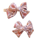 | one size | bows approx 3.5" wide | clip 2.25" long | headband 6.5" foldover length |